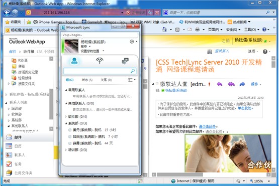 體驗(yàn)中心底層采用了基于Windows Server 2008 R2作為操作系統(tǒng)平臺(tái),并以此構(gòu)建全新的活動(dòng)目錄服務(wù)及文檔權(quán)限管理服務(wù),在操作系統(tǒng)平臺(tái)上搭建了包括Exchange Server 2010、Lync Server 2010、Sharepoint 2010在內(nèi)的完整商業(yè)辦公平臺(tái)應(yīng)用,并將以太網(wǎng)通過VoIP語音網(wǎng)關(guān)與傳統(tǒng)的模擬電話程控交換機(jī)相連接,提供了將電話、郵件(包括語音郵件)、日歷、視頻會(huì)議、即時(shí)消息、文檔即時(shí)協(xié)作等應(yīng)用直接關(guān)聯(lián)起來,帶來了前所未有的辦公體驗(yàn)。